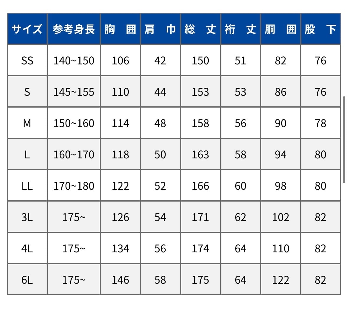 ※作業着のため通常の衣類より大きい作りとなります。サイズ表をご確認の上ご購入ください。